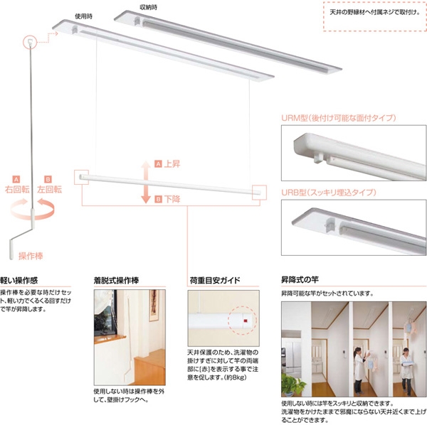 ・天井保護のため、洗濯物の掛けすぎに対して竿の両端部に[赤]を表示する事で注意を促します。(約8kg)