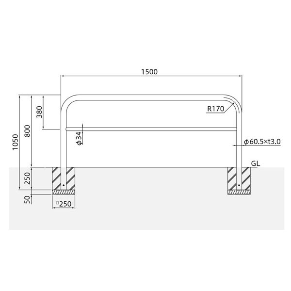 バリカー横型 車止め スタンダード ステンレスタイプ φ60.5 W1500 H800 横桟付き